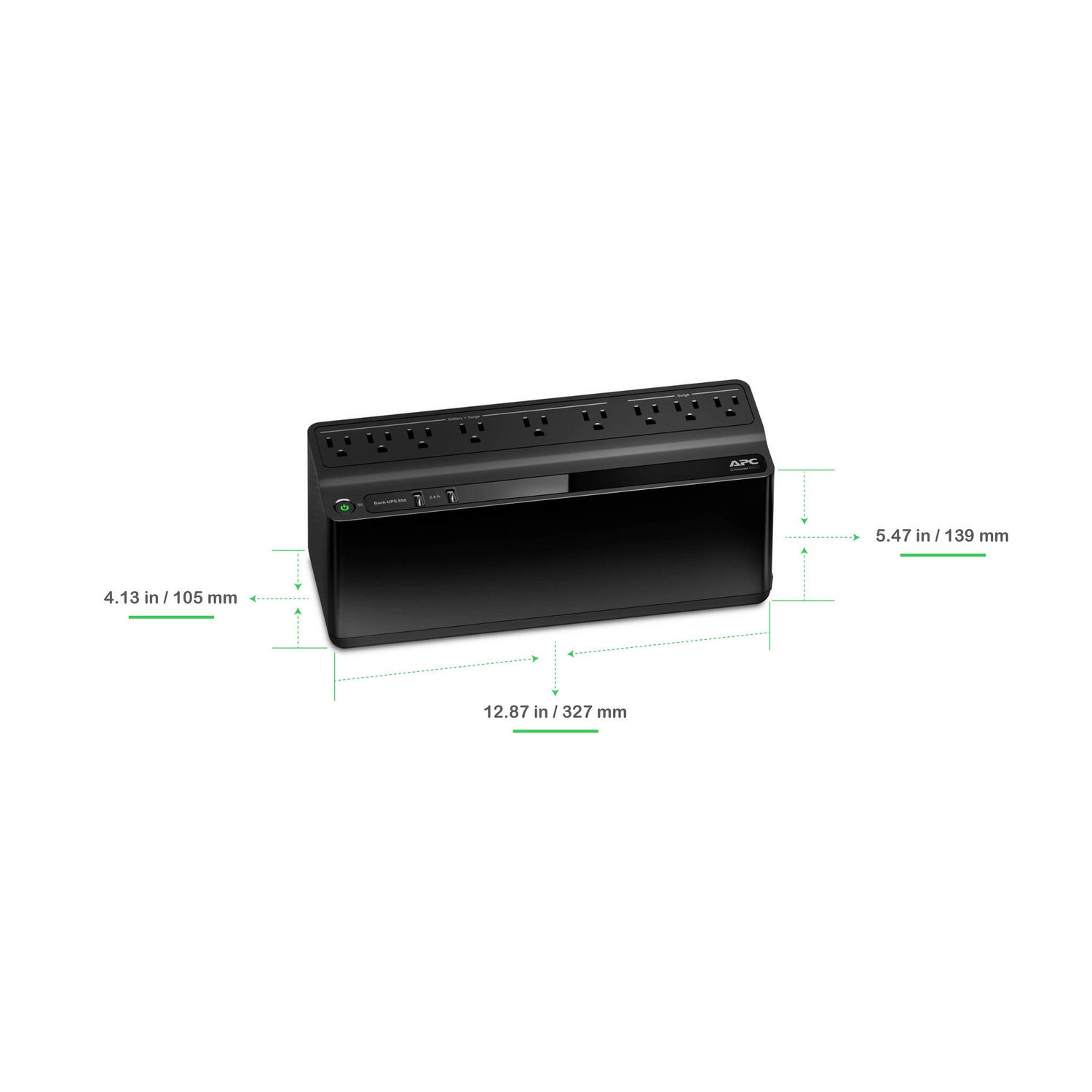 This APC Back-UPS offers power and surge protection for wireless networks, computers, gaming consoles and other electronics in your home or business. The 850VA floor/wall mount UPS has 9 total outlets, 6 of which are battery back up and surge protection, and 3 that are surge protection only. It has a surge energy rating of 354 Joules. The 450w capacity is ideal for workstations, keeping you connected and productive during power fluctuations. This battery backup is designed to power wireless home networking devices (router and modem) for hours during utility outages so you can stay connected and productive. Connect and charge mobile devices via the 2 USB port provides a maximum of 1.5A . The USB port will provide power when the UPS is both on utility and battery power. This computer backup offers lifetime guaranteed surge protection with a $75,000 equipment protection policy. The side of this 850VA UPS includes 2 keyhole sockets to easily mount the battery backup on a wall in hard to reach installations. The outlets are arranged with spaces to accommodate both average sized power plugs and transformer block power plugs. This UPS has a 3-year warranty and CE product certification. It is compatible with a dedicated user-replaceable battery, and the APC replacement battery cartridge helps restore UPS performance to the original specifications. Package Contains Battery backup & surge protector, USB cable and user manual